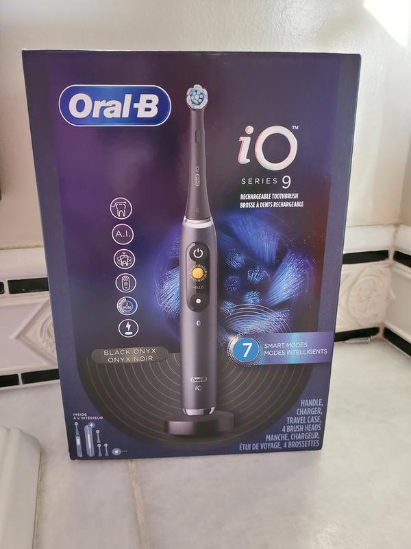 Oral b io packaging-Replace your Oral B io series replacement brush heads every 3 months For best results COMPATIBLE ONLY WITH ORALB iO REFILL HEADS You Will Receive 1 OralB iO Series 9 Black Onyx electric toothbrush, 4 OralB iO Ultimate Clean replacement brush heads, and a powerful charging travel case PERFECT PRESSURE Signals red when brushing too hardUp to 100% more plaque removal and healthier gums vs a regular manual toothbrush;
